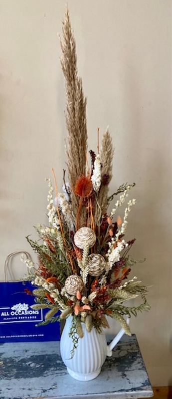 This stunning tall dried flower arrangement, elegantly displayed in an ornate ceramic jug, makes a striking centrepiece that brings a touch of style and sophistication to any home or office space.