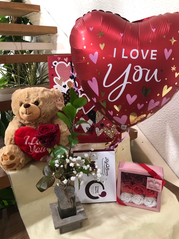 Teddy, red rose in a vase, Lily O'Brien Chrispy Heart chocolates, rose mixed bath petals, gift bag and helium Balloon.